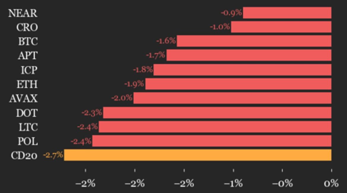 Bitcoin Cash (BCH) fell 7% and Ripple (XRP) dropped 4.7%, leading the index lower.